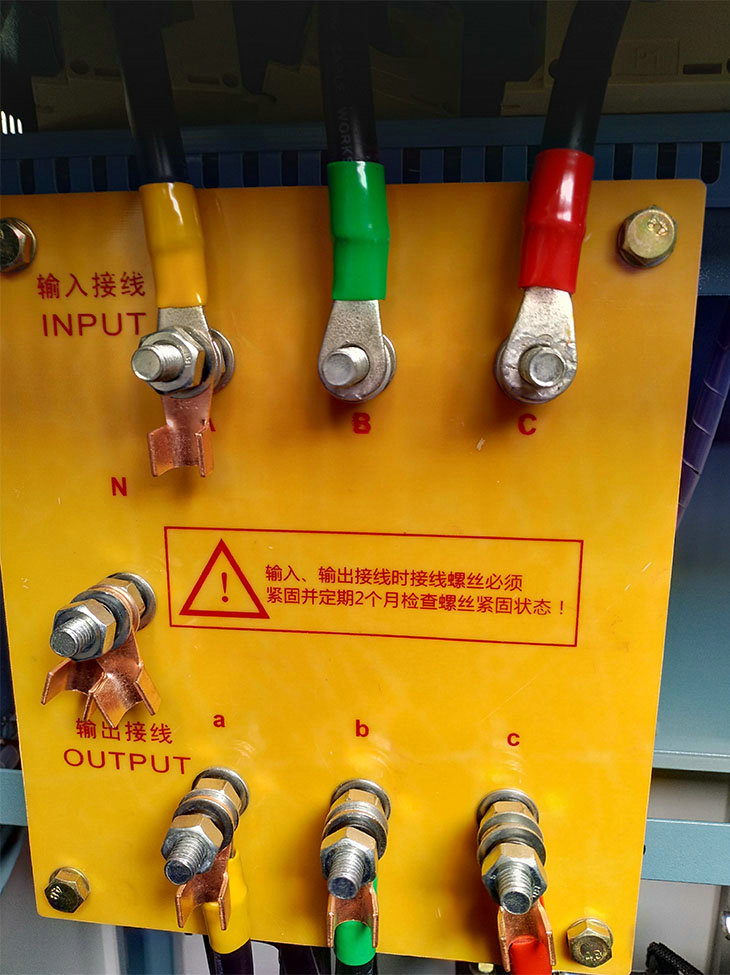 2.進線端電源線應(yīng)接在穩(wěn)壓器的輸入端,并按母線的顏色:黃接A相、綠接B相、紅接C相,出線端電源線應(yīng)接在穩(wěn)壓器的輸出端,并按母線的顫色:黃接A相、綠接B相、紅接C相,到接零“N”的接線柱上,機箱外殼應(yīng)和大地聯(lián)接,接地電阻應(yīng)小于0.4歐姆;